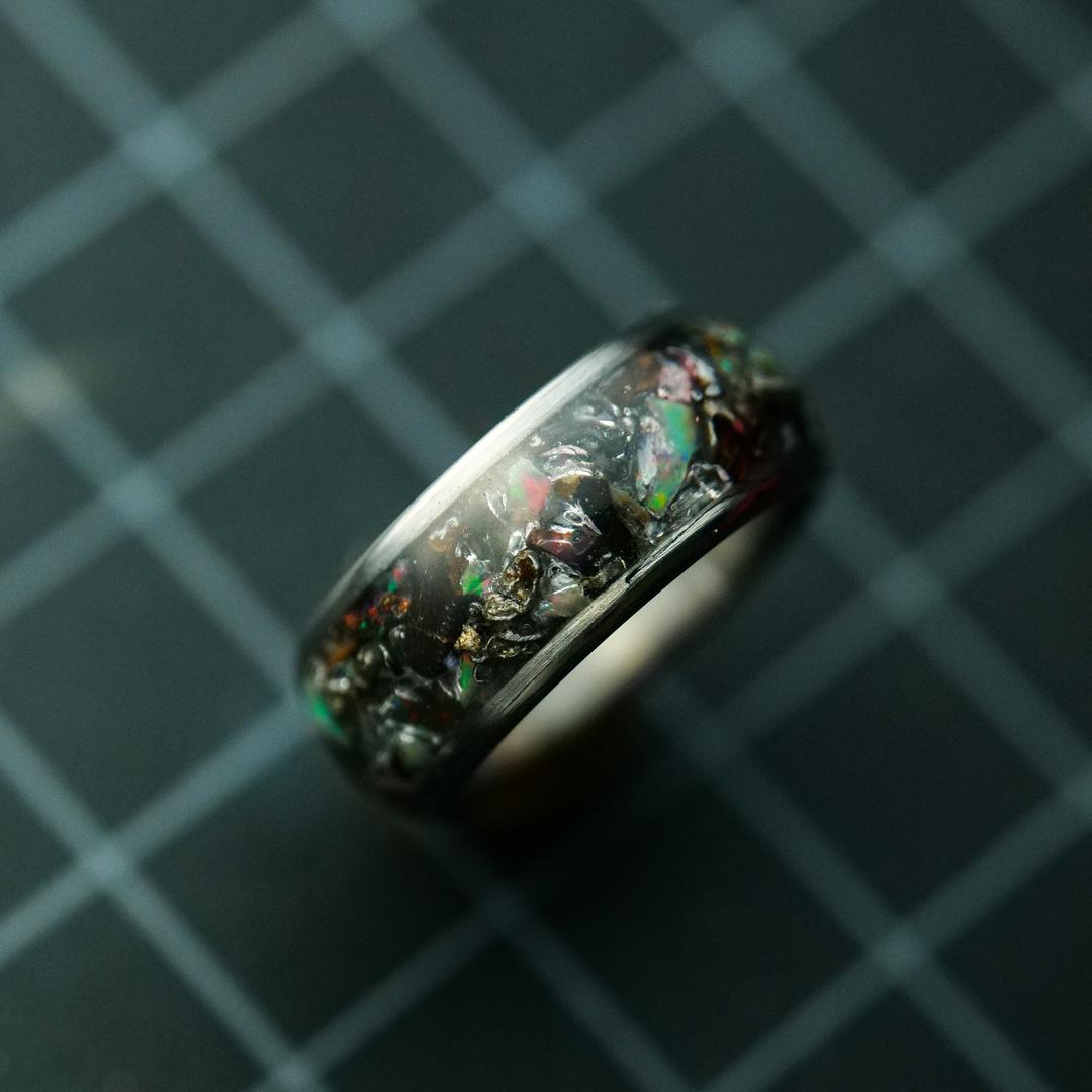 The Halo Ring comes standard with three types of opal, (Australian Rainbow Matrix, Ethiopian Fire, Ethiopian Welo), two types of meteorites (Muonionalusta and Campo del Cielo), and two types of fossilized tooth fragments (T-rex, Megolodan). This combination of materials was hand-picked with thought and integrity. Since each ring is handmade, made to order there are endless customization possibilities, truly making this a ring with no limits. When Patrick was concocting the design for this ring, he really wanted to create a ring that had a rich history, something that tells a story by itself. Most, if not all of these materials may be foreign to you, but that's why we're here, to let you know exactly what these materials are and why there were included in The Halo Ring.
