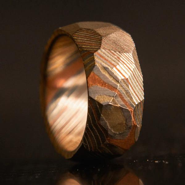 Patrick Adair Designs does not offer a natural obsidian ring due to its fragility, but we do offer our own form of an obsidian ring through our Obsidian Series. The Obsidian Series is a collection of exotic rings made from materials from meteorite to superconductors to mokume gane. All of our rings as part of this collection feature a unique faceted finish on the exterior to make it look like a snowflake obsidian. These facets are are all deliberate and hand-finished to accentuate the uniqueness of the material. The facets allow for beautiful reflections and luster.