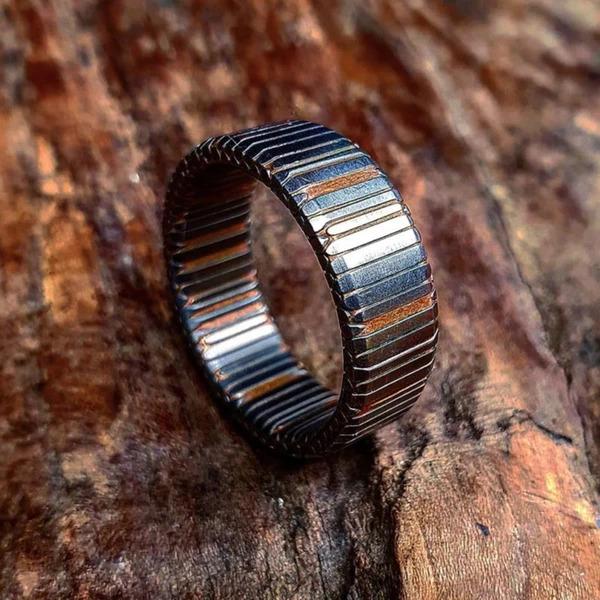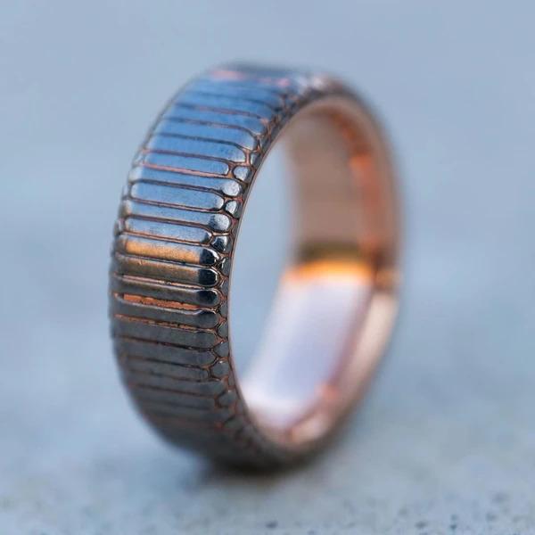 Depending on the style of ring, the rod is either cut straight or at an axis for a different pattern. We offer our Superconductor Wedding bands with two different options: etched or unetched and straight cut or tilted cut. We also offer a stunning combination of Superconductor and Rose Gold. The copper from the Superconductor compliments the copper from the Gold perfectly. There could not be a better combination than these two materials!