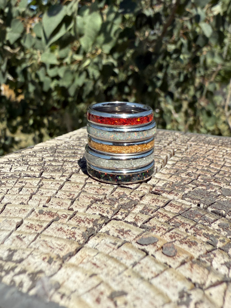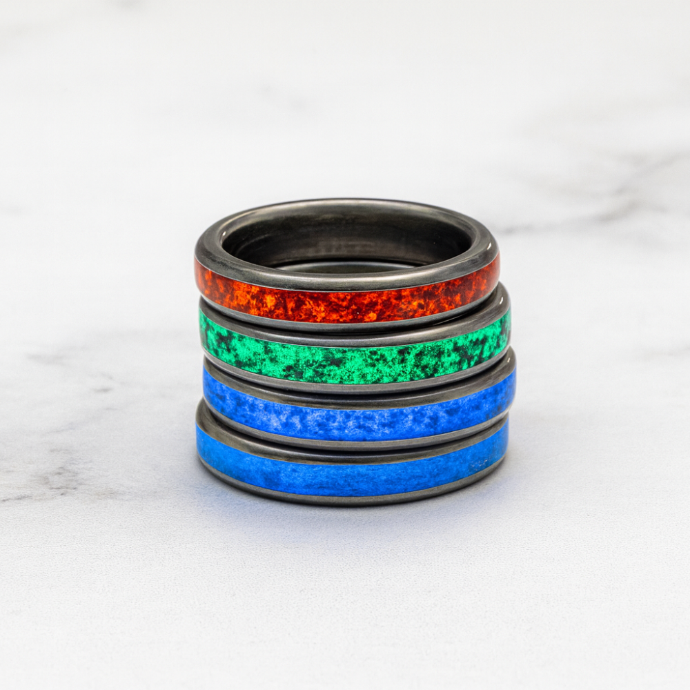 Precious Inlays: Genuine exotic materials like meteorite and brilliant bello opal set in our signature glowstone resin.