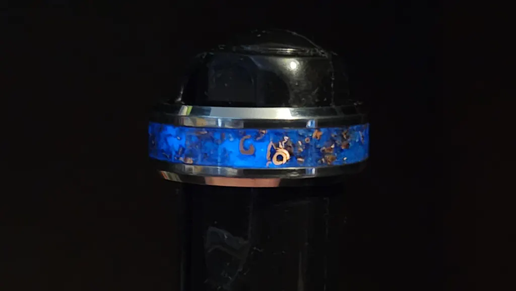 The site picture looks to have a lot of black to tone down the colors, but the ring I got is much more of a royal blue and copper-green (see attached photos). I still really like the way it looks and I wear it casually, but it won't match the suit I had in mind. The glow at night is awesome, with a very nice mottled appearence in the intensity that's a bit harder to get the camera to agree with the ol' eyeballs on.