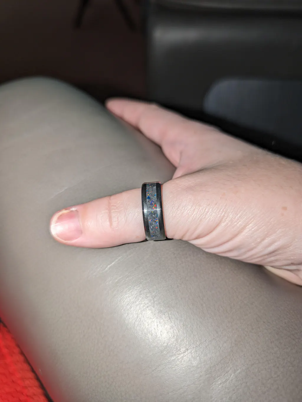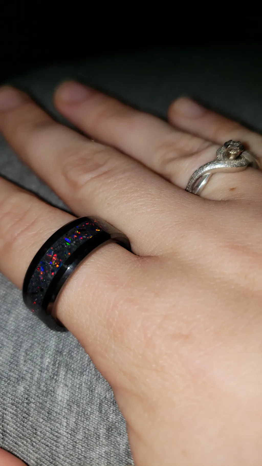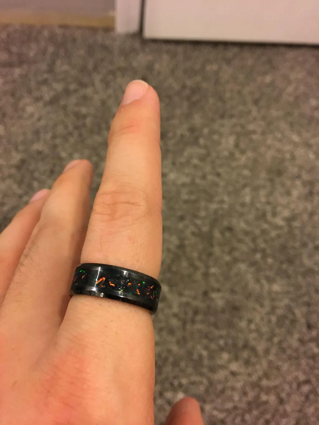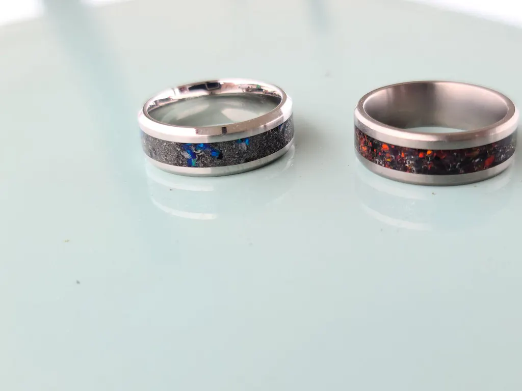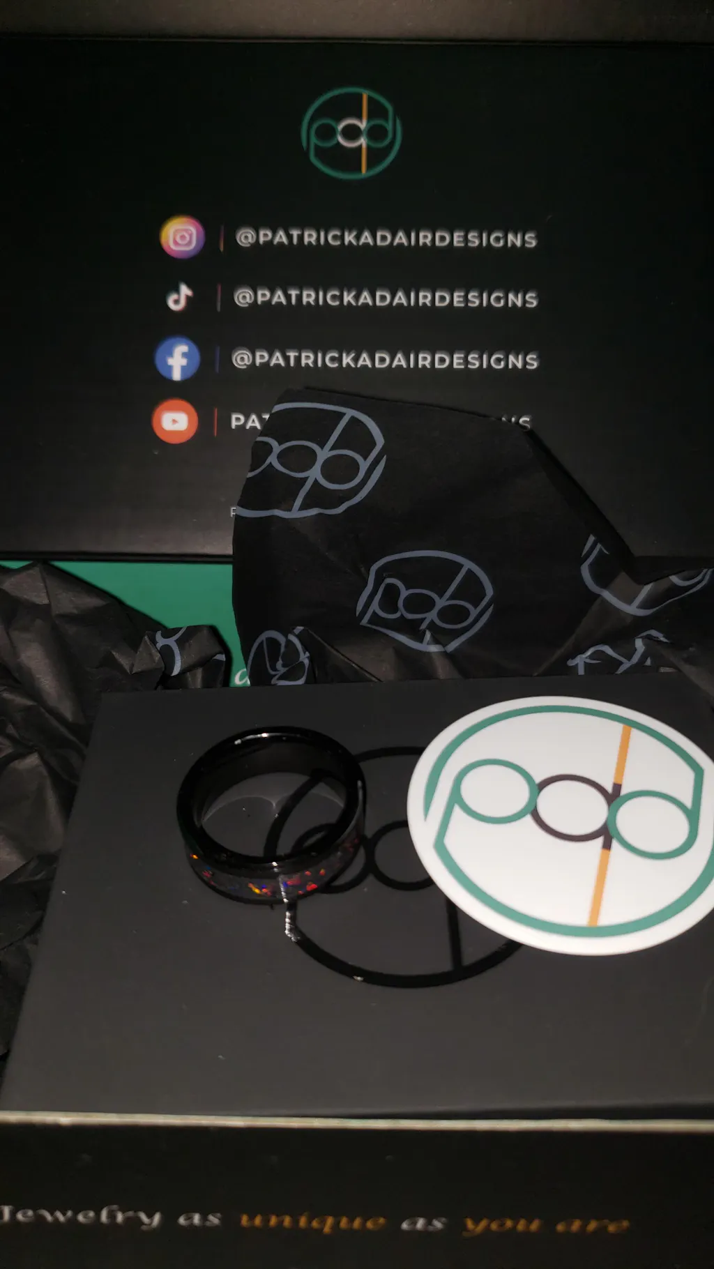 I chose Patrick Adair Designs because I love to support american made and small businesses. Alot of work and tools goes into making these, and the product definitely shows the passion that's put into the product, which I love. My s/o was also is a longtime fan, watching his YouTube videos since Patrick was making rings in his garage, and got me mesmerized. He's also into designing things, Cadd/3D printing and I'm artsy, love jewelry/rings and I love "different" so this fit what we're into. These guys are definitely "the lords of the rings". I chose the Ember Glowstone Ring because I wanted to get him something a little lighter than black in the middle, yet simple. And I love opal and multi-color rainbows! Love the edgy black aestectic since he plays games and Magic the Gathering. The inside band of the Ember Glowstone ring hits darker and lighter in different lighting, and does glow. You'll have to get out the macro-lens for it. It shipped immediately, 1st-class USPS after 2 weeks of processing. Will definitely have to order more and I'm a longtime fan, and unboxing the package almost made me get emotional it was so beautiful.💙